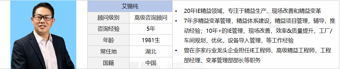 擅長業(yè)務(wù):精益管理體系建設(shè)和完善能力,精通精益生產(chǎn)、質(zhì)量體系完善,阿米巴、6S、數(shù)據(jù)治理等,擅長運(yùn)用新技術(shù)、創(chuàng)新性思維發(fā)現(xiàn)并提出改進(jìn)建議;IE體系建設(shè)和完善能力,精通新產(chǎn)品導(dǎo)入,質(zhì)量策劃,產(chǎn)品結(jié)構(gòu)優(yōu)化,可制造性評估,質(zhì)量風(fēng)險(xiǎn)評估,工藝排布,標(biāo)準(zhǔn)工時(shí)測定,標(biāo)準(zhǔn)人力,標(biāo)準(zhǔn)產(chǎn)能規(guī)劃,標(biāo)準(zhǔn)作業(yè)系統(tǒng)建立與維護(hù),線平衡分析, 工廠/車間布局與優(yōu)化、生產(chǎn)資源規(guī)劃,現(xiàn)場改善,設(shè)備工裝導(dǎo)入評估;新廠房的整體規(guī)劃布局;熟悉智能化,數(shù)字化,自動化布局,AGV&RGV應(yīng)用,智能倉儲應(yīng)用等。
