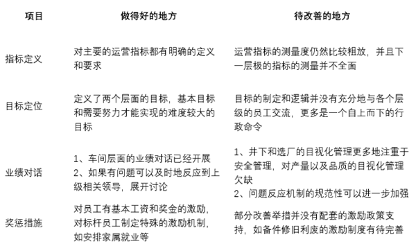 該銅礦目前已經(jīng)建立了一套完整的業(yè)績管理體系,然而在指標的精確衡量,目標的溝通,以及業(yè)績對話和獎懲機制上仍有一定的提升空間項目做得好的地方待改善的地方