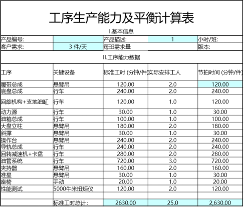 平衡率=【單件標(biāo)準(zhǔn)時(shí)間總和÷(瓶頸時(shí)間X工位總數(shù))】×100%==2630 ÷(720X15)X100%=24.35%。
