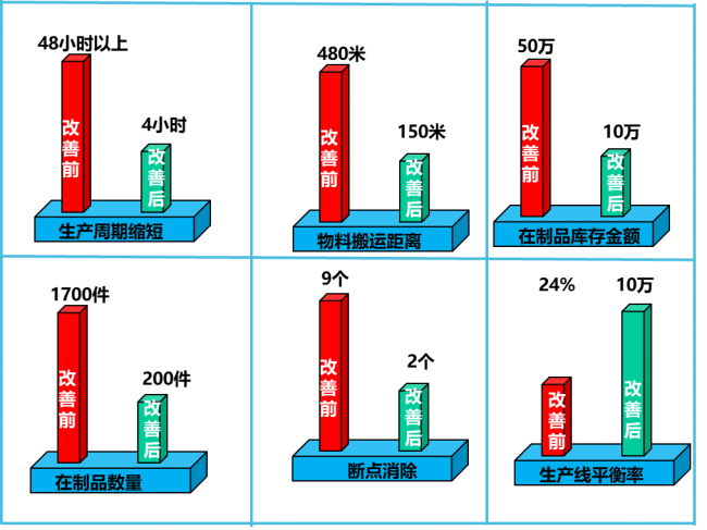“如果你不能迅速把產(chǎn)品開發(fā)時(shí)間減半、訂貨時(shí)間減少70%、生產(chǎn)周期縮減90%,那你一定是哪兒做錯(cuò)了”。因此,為了縮短生產(chǎn)周期,車間以組建生產(chǎn)線、工序間改善為抓手,著力實(shí)現(xiàn)生產(chǎn)周期優(yōu)化。通過打破班組間壁壘,再造生產(chǎn)組織,整合4個(gè)班組到1個(gè)班組,將10個(gè)生產(chǎn)工序拉成新的生產(chǎn)線,降低產(chǎn)線瓶頸工序時(shí)間,消除過程等待浪費(fèi)。產(chǎn)線重組消除了從下料到裝配搬運(yùn)浪費(fèi),單件周轉(zhuǎn)距離從480米減少至150米,周轉(zhuǎn)次數(shù)由6次降為1次,斷點(diǎn)9個(gè)降為2個(gè),生產(chǎn)周期從48小時(shí)降至4小時(shí)。