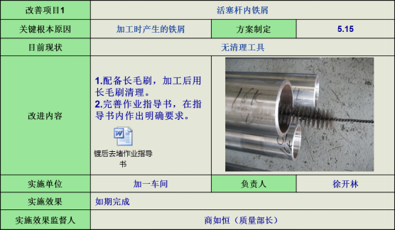 9)活塞桿內(nèi)鐵屑,針對加工時產(chǎn)生的鐵屑問題,著重清理活塞桿內(nèi)鐵屑。