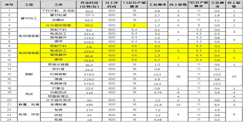 各工序工時測算及工位計算: