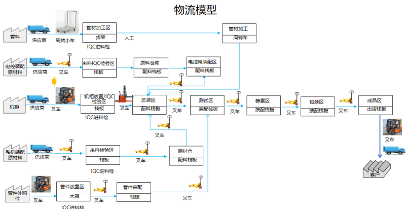 1. 整機裝配工位叉車運送,工序間傳送不方便