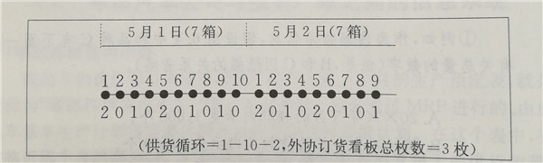 A.送達次數。有關零部件C的看板每天送達10次,成品本部件供貨在第2次之后。也就是,供貨備環是1-10-2