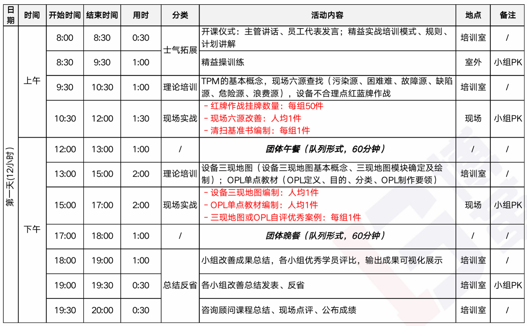 主題性:每次培訓(xùn)會(huì)根據(jù)企業(yè)的需求選擇不同的主題,包含但不限于:現(xiàn)場(chǎng)5S、TPM、標(biāo)準(zhǔn)作業(yè)、六源改善、質(zhì)量改善、快速切換、產(chǎn)線平衡、工位布置、浪費(fèi)識(shí)別與改善、QC/IE工具應(yīng)用等