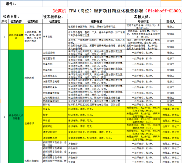 針對主要采掘設備、主運輸設備試點,梳理現場6S基本要求、設備可視化項目檢查、設備檢修及運行現場動態檢查、設備自主保全、全員維護記錄,編制TPM(崗位)維護項目精益化檢查標準工單。