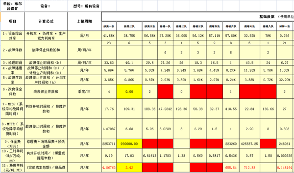 2015年年底,由礦機電辦制作在用采掘設備、主運輸設備履歷信息表模板下發各單位填寫、月度上報,包括設備總覽技術特征匯編、不同設備履歷分頁預覽,主要內容有設備遷入、遷出時間、大型部件、備件更換情況、數量、更換原因等,為TPM設備保全管理提供了詳細的基礎資料、也為內部調劑單位提供了詳細的設備服役期狀況參考,提升設備狀態把握水平
